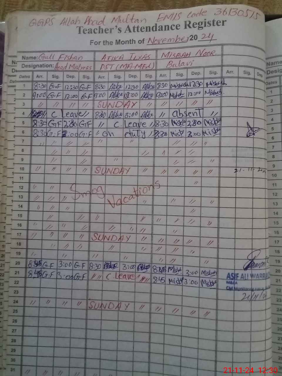 | CNIC | Full Name | Designation | R/C | Absence During Last Calender Month |