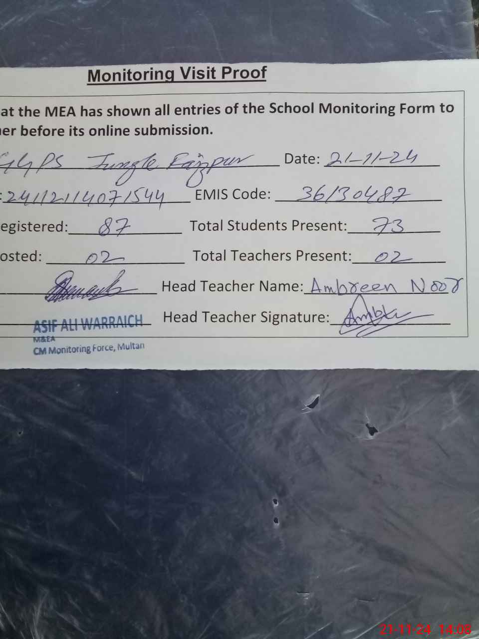 | Attendance Register | Head Teacher | MEA with School | Visit Proof |