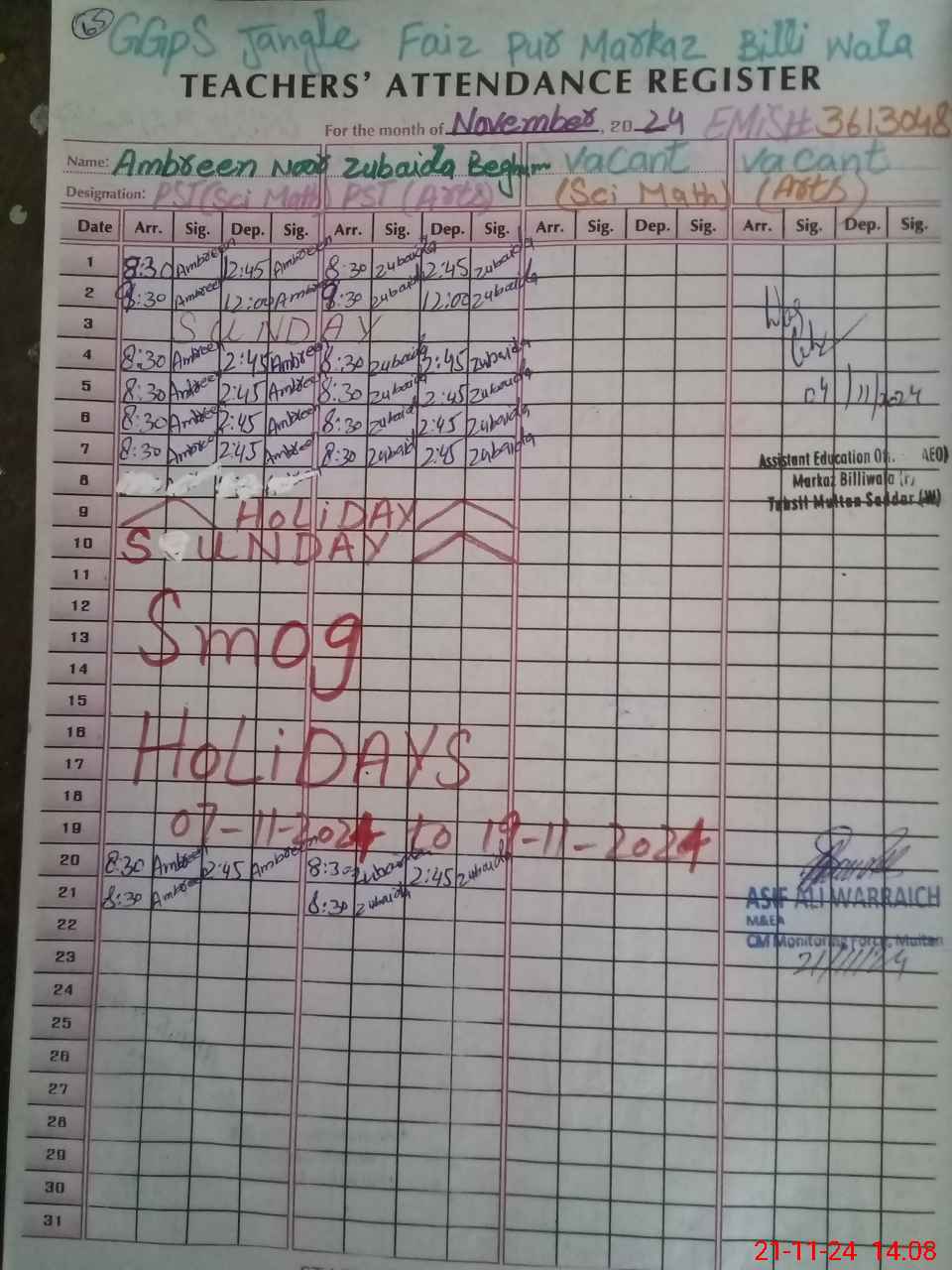 | Name: Am**** No**** Designation: (School Headmaster's/Headmistress's) PST/PTC/JV Phone/Cell Number: 03**** |
