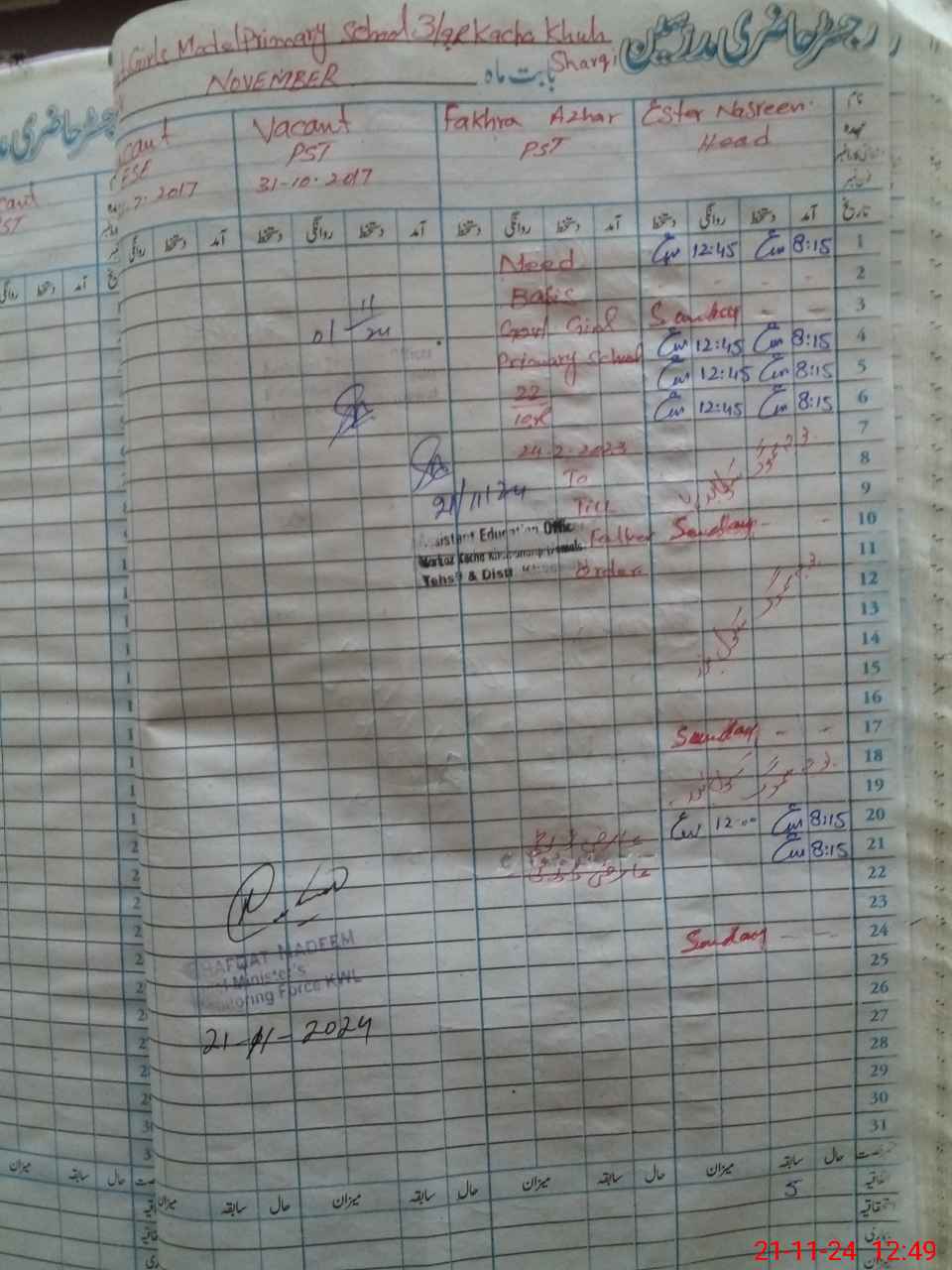 | Remarks (Use Separate Page if Required): PST teacher Fakhra Azhar showing on temporary duty in Gmps 22 10R from 24 February 2023 till now but temporary duty order not renewed up till now Nsb and FTF record not maintained | |||||