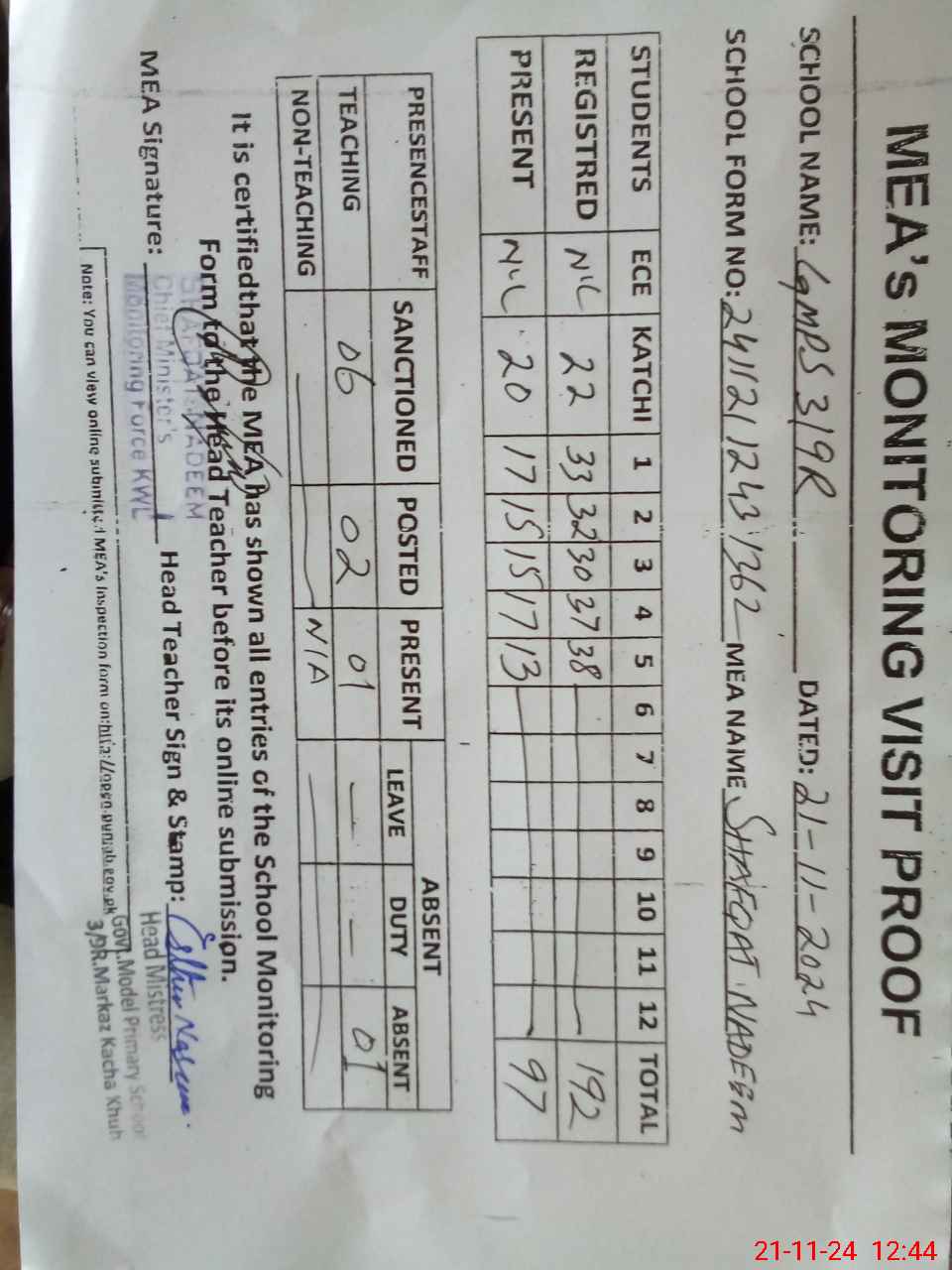 | Attendance Register | Head Teacher | MEA with School | Visit Proof |