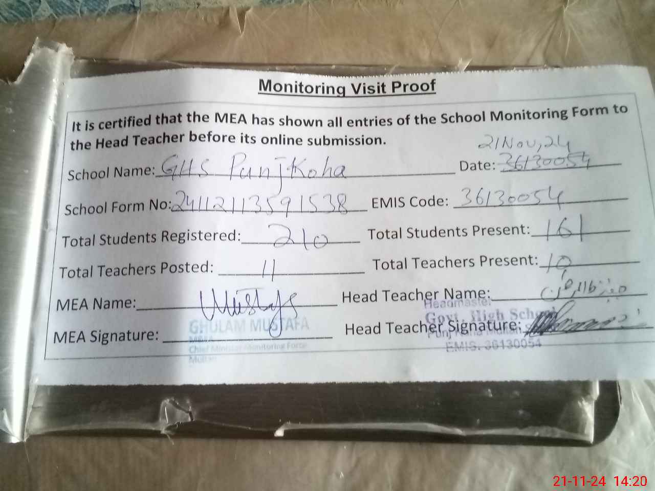 | EMIS Code: 36130054 | Name of School: GHS PUNJ KOHA MULTAN | |||