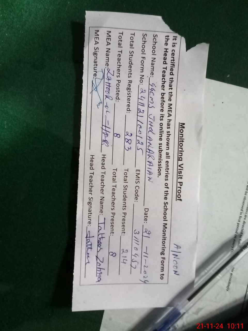 | Attendance Register | Head Teacher | MEA with School | Visit Proof |