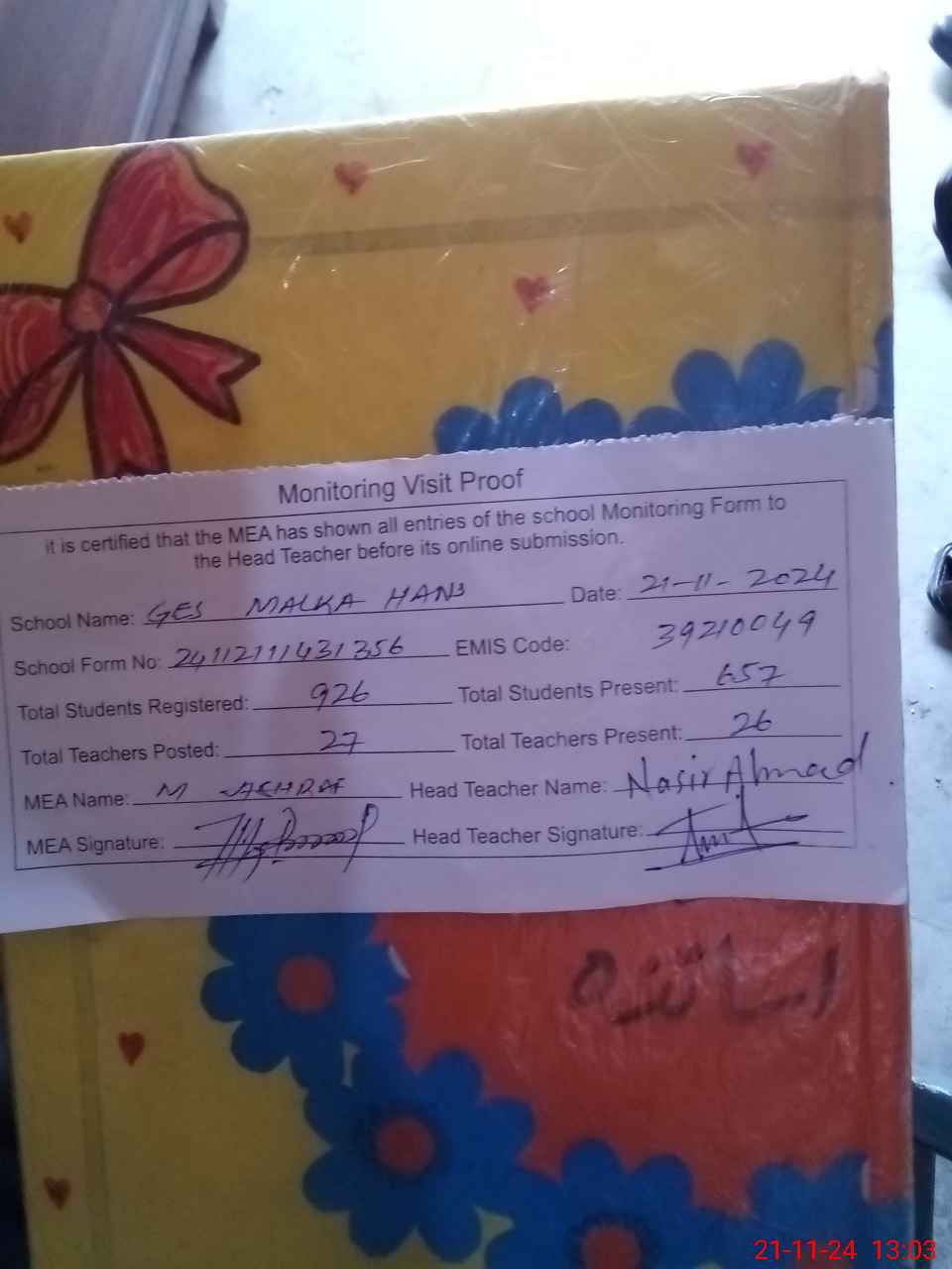| Attendance Register | Head Teacher | MEA with School | Visit Proof |