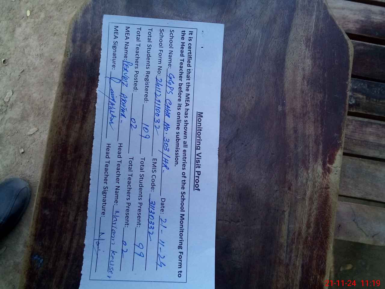 | Attendance Register | Head Teacher | MEA with School | Visit Proof |