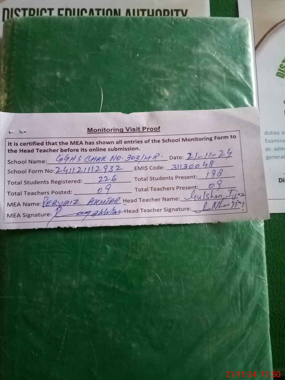 | Attendance Register | Head Teacher | MEA with School | Visit Proof |