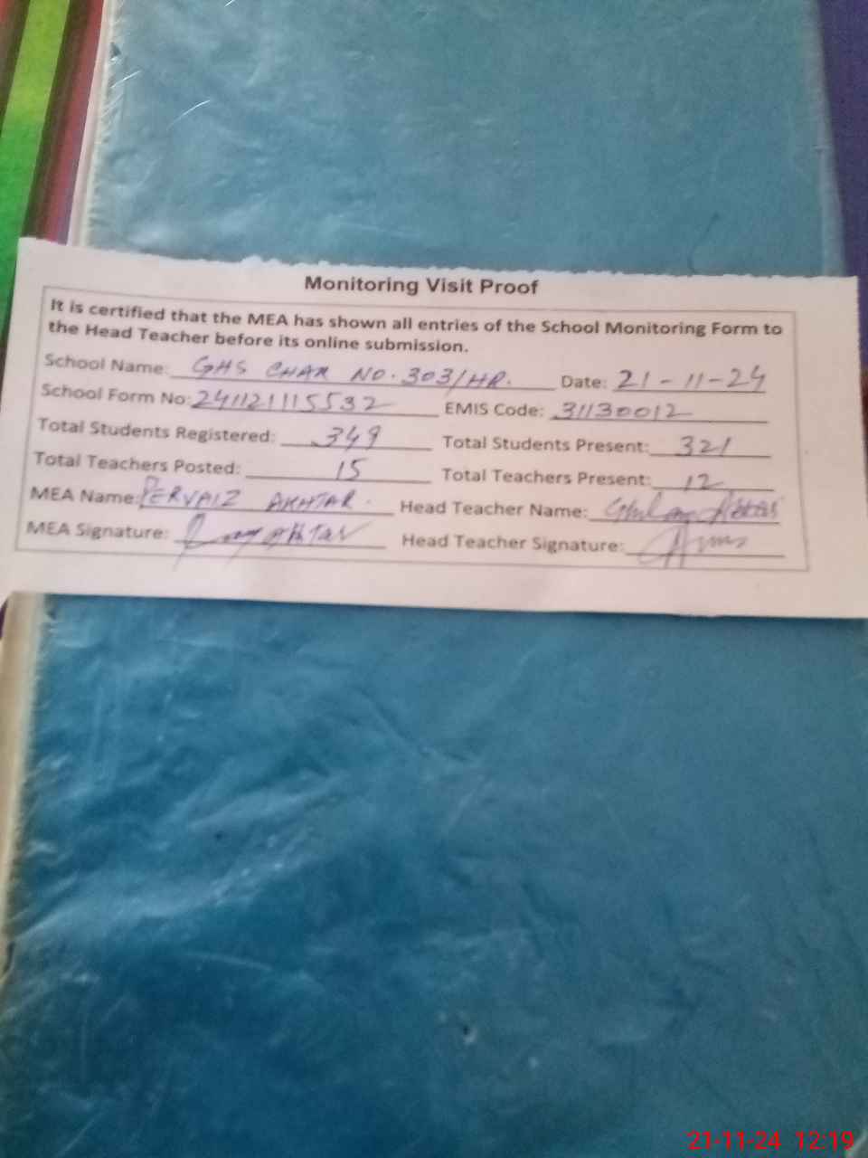 | EMIS Code: 31130012 | Name of School: GHS CHAK 303/HR | |||