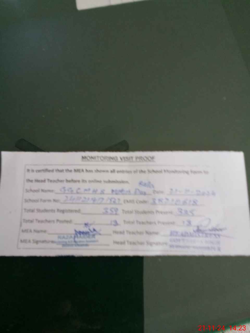 | Attendance Register | Head Teacher | MEA with School | Visit Proof |
