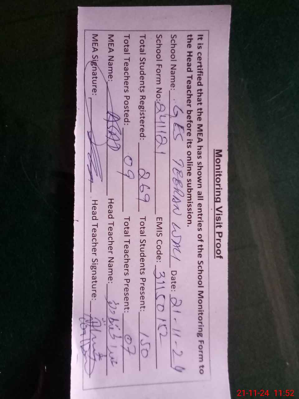 | Attendance Register | Head Teacher | MEA with School | Visit Proof |
