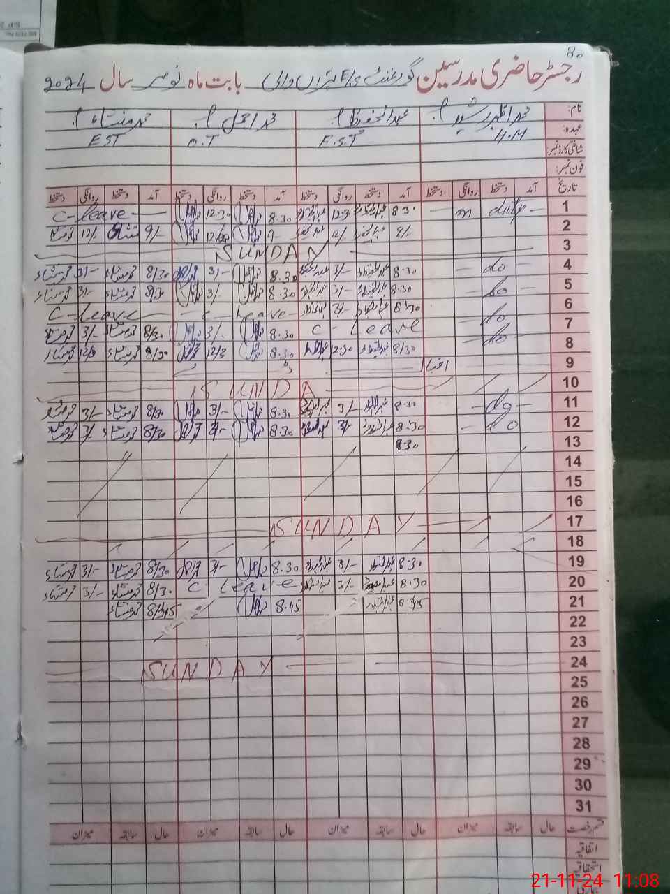 | CNIC | Full Name | Designation | R/C | Absence During Last Calender Month |