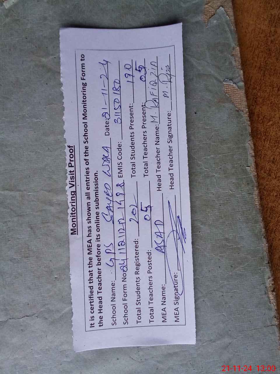 | Attendance Register | Head Teacher | MEA with School | Visit Proof |