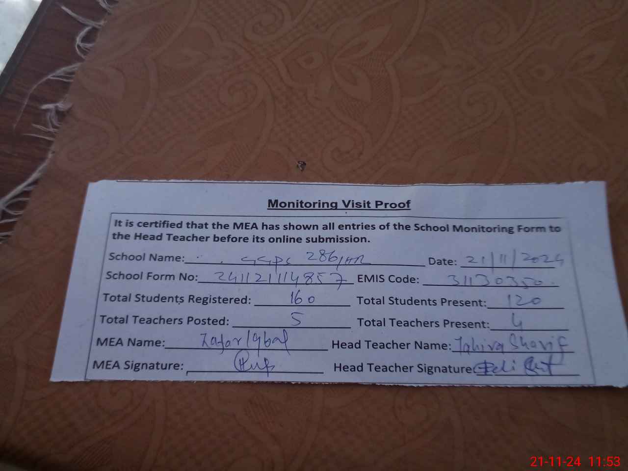 | Attendance Register | Head Teacher | MEA with School | Visit Proof |