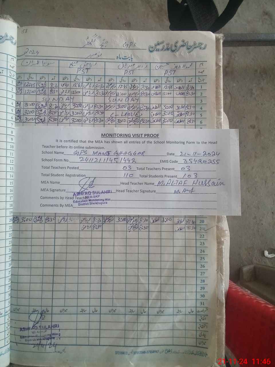 | Attendance Register | Head Teacher | MEA with School | Visit Proof |