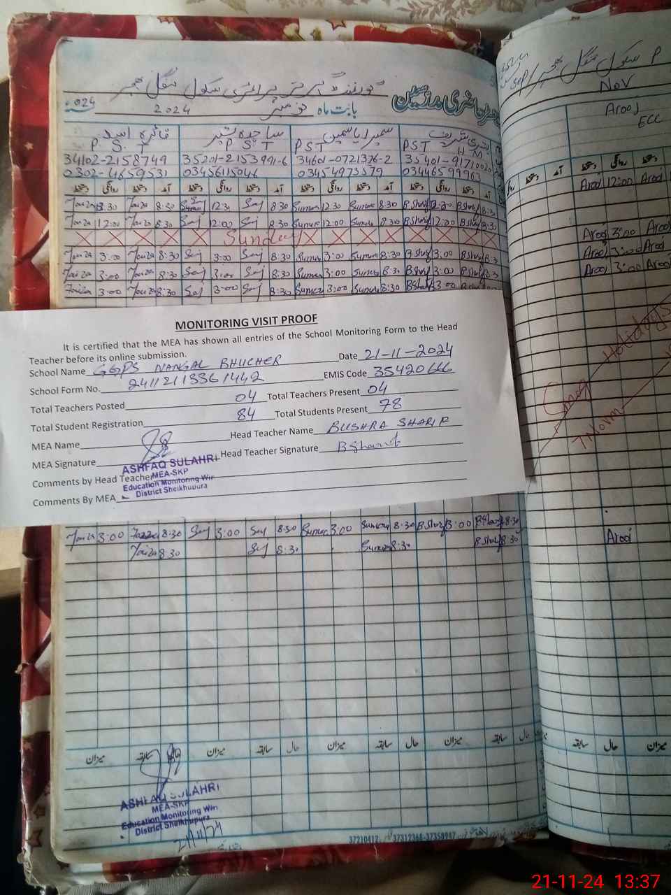 | Attendance Register | Head Teacher | MEA with School | Visit Proof |