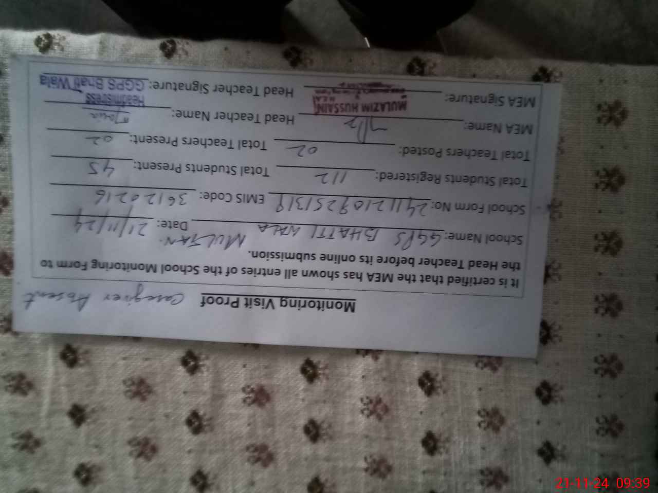 | Certified that this School was Inspected by the Undersigned MEA/DMO Today and the Information Stated Above is as Per Record. | |||||