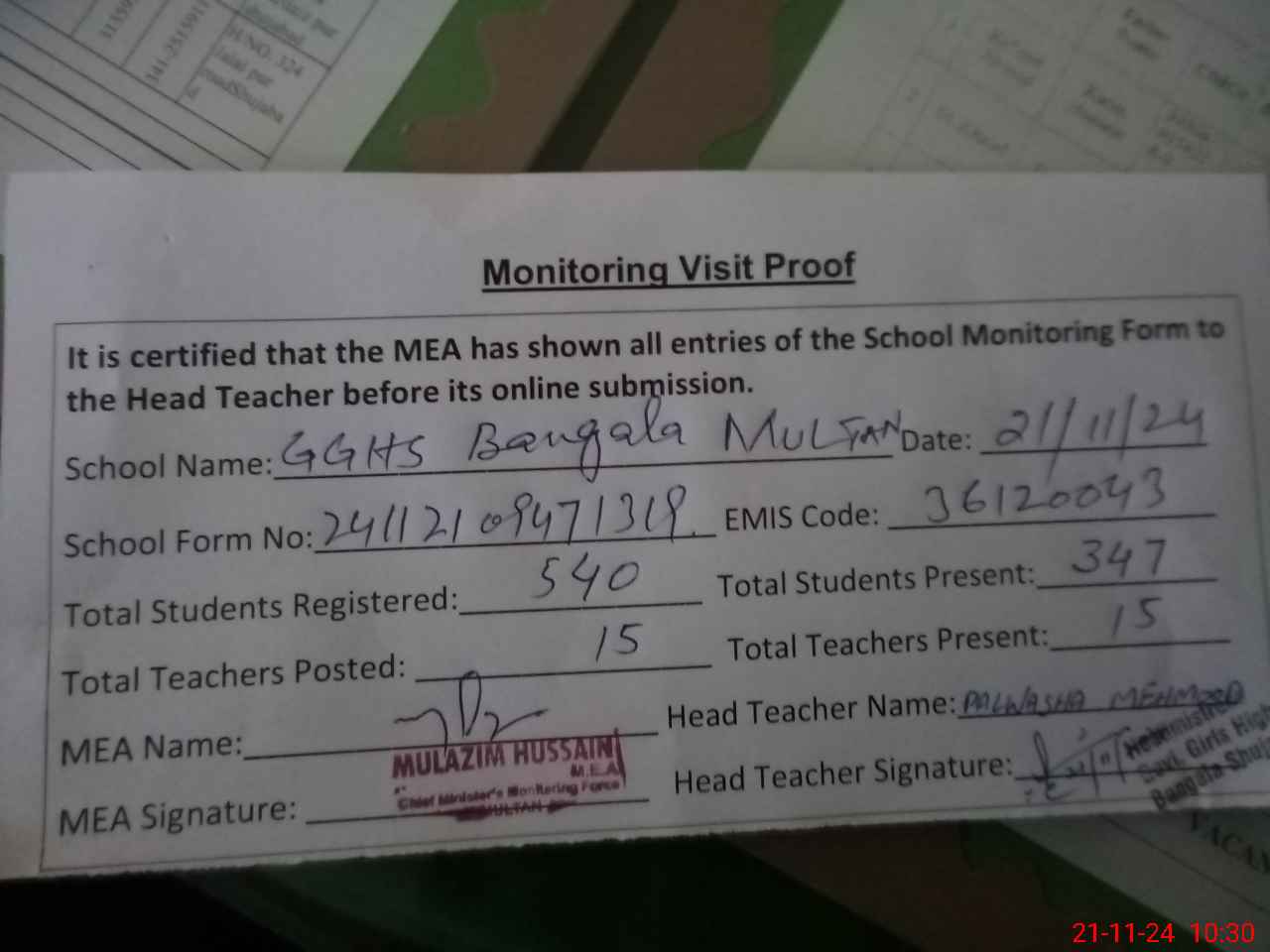| Attendance Register | Head Teacher | MEA with School | Visit Proof |