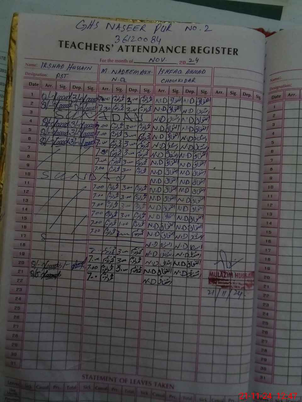 | CNIC | Full Name | Designation | R/C | Absence During Last Calender Month |