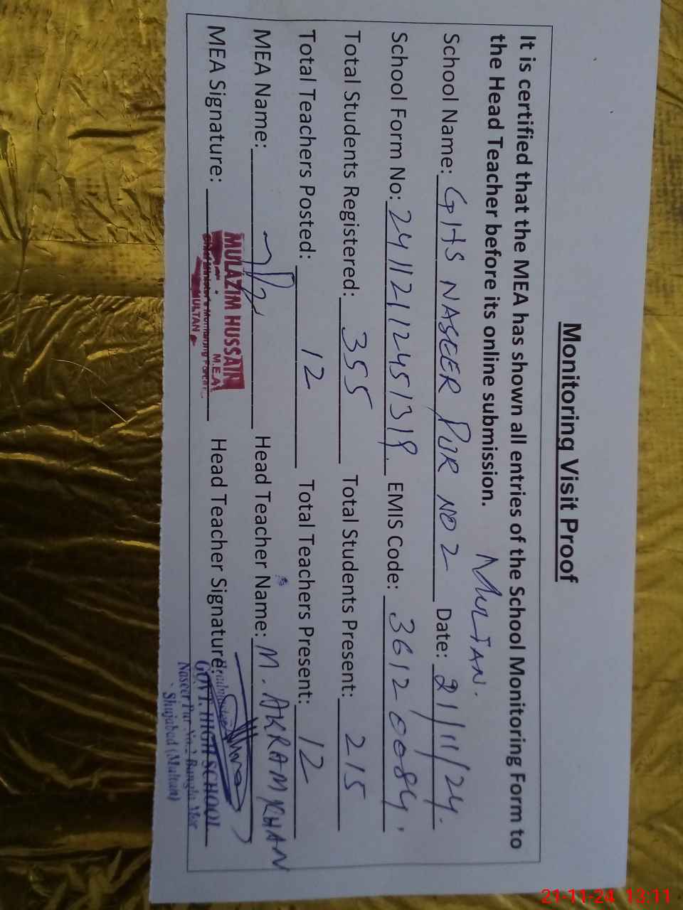 | Attendance Register | Head Teacher | MEA with School | Visit Proof |