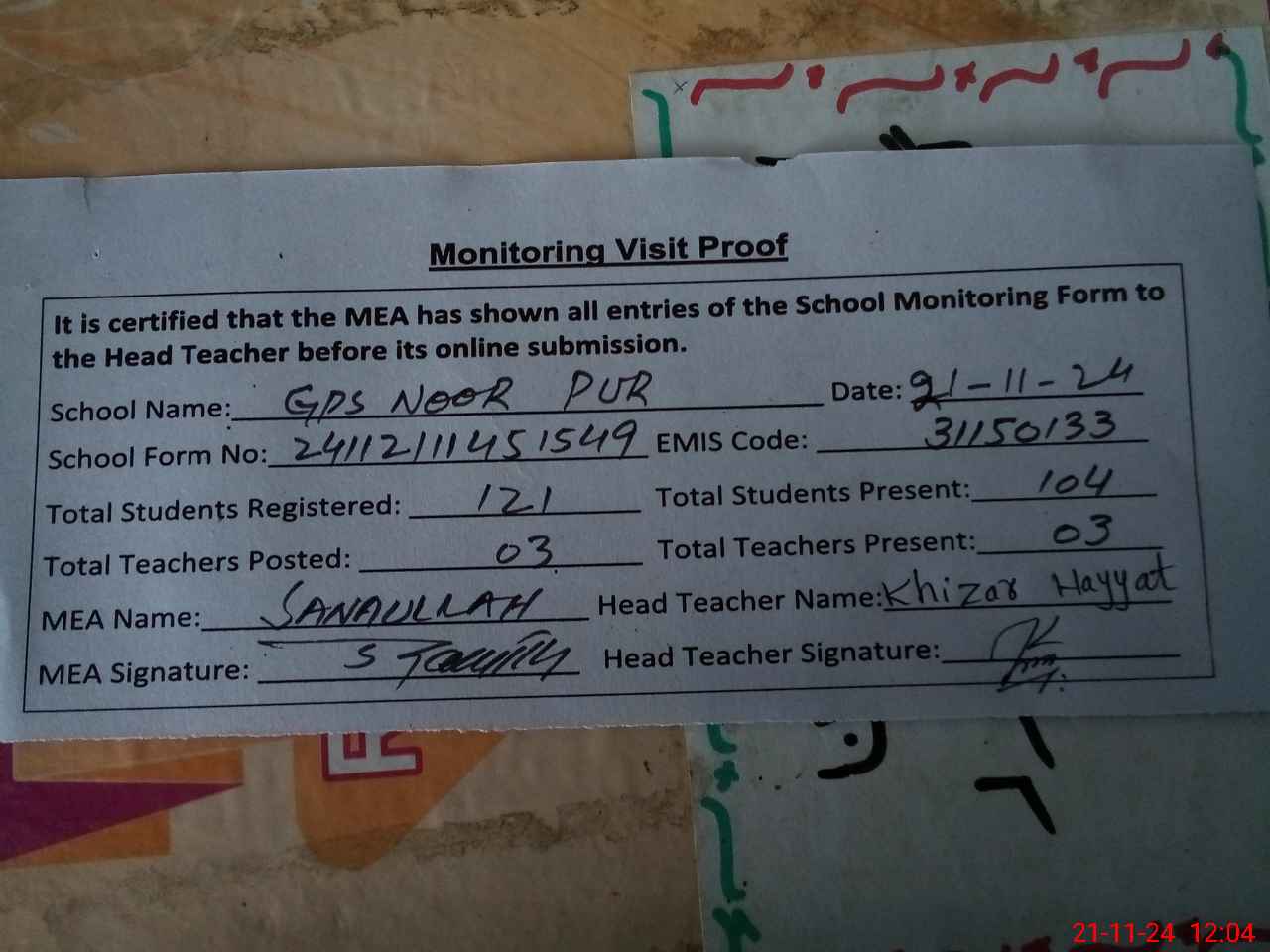 | EMIS Code: 31150133 | Name of School: GPS NOOR PUR | |||