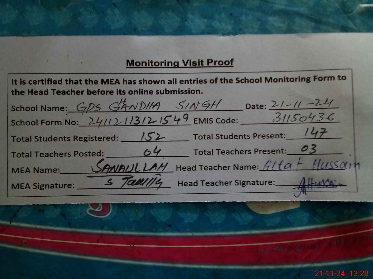 | EMIS Code: 31150436 | Name of School: GPS GHANDHA SINGH | |||