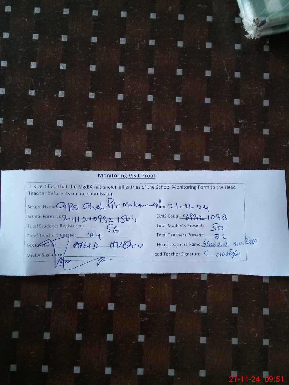 | EMIS Code: 39321038 | Name of School: GPS CHAH PIR MUHAMMAD | |||