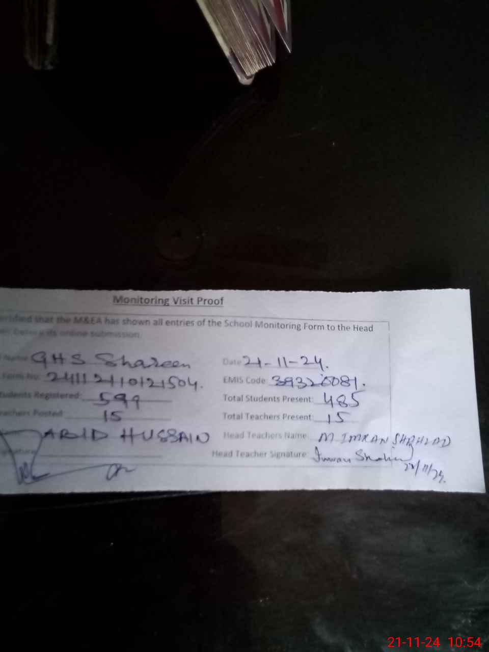 | Attendance Register | Head Teacher | MEA with School | Visit Proof |