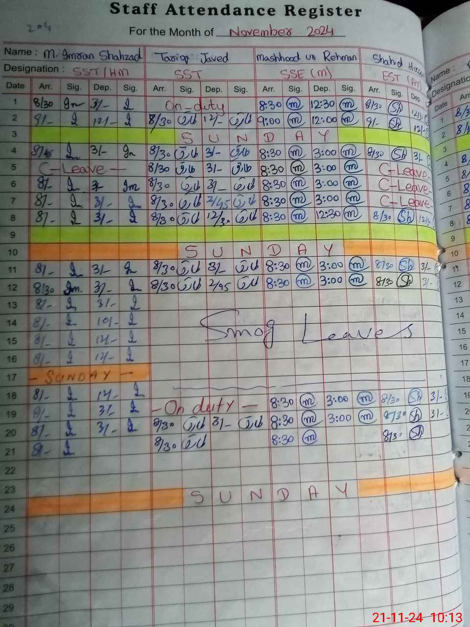 | CNIC | Full Name | Designation | R/C | Absence During Last Calender Month |