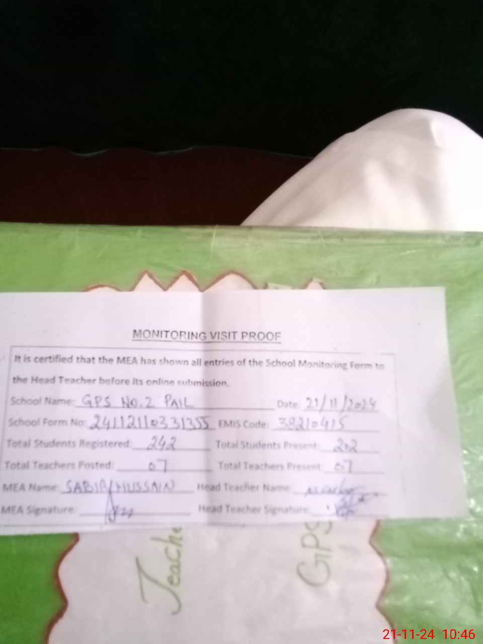 | Certified that this School was Inspected by the Undersigned MEA/DMO Today and the Information Stated Above is as Per Record. | |||||