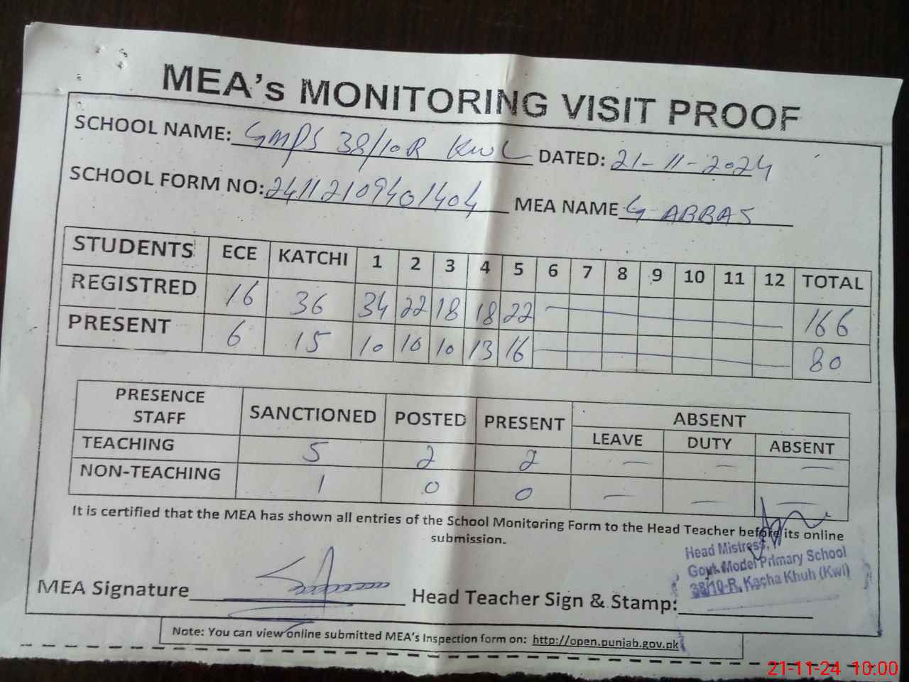 | Attendance Register | Head Teacher | MEA with School | Visit Proof |