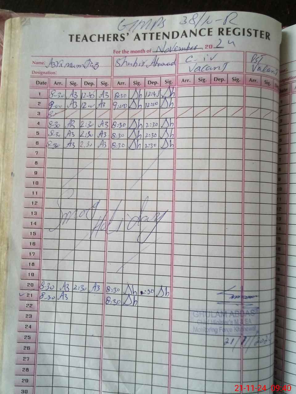 | Name: AZ**** MU**** Designation: (School Headmaster's/Headmistress's) PST Phone/Cell Number: 03**** |
