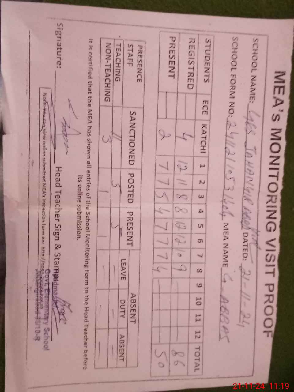 | Attendance Register | Head Teacher | MEA with School | Visit Proof |