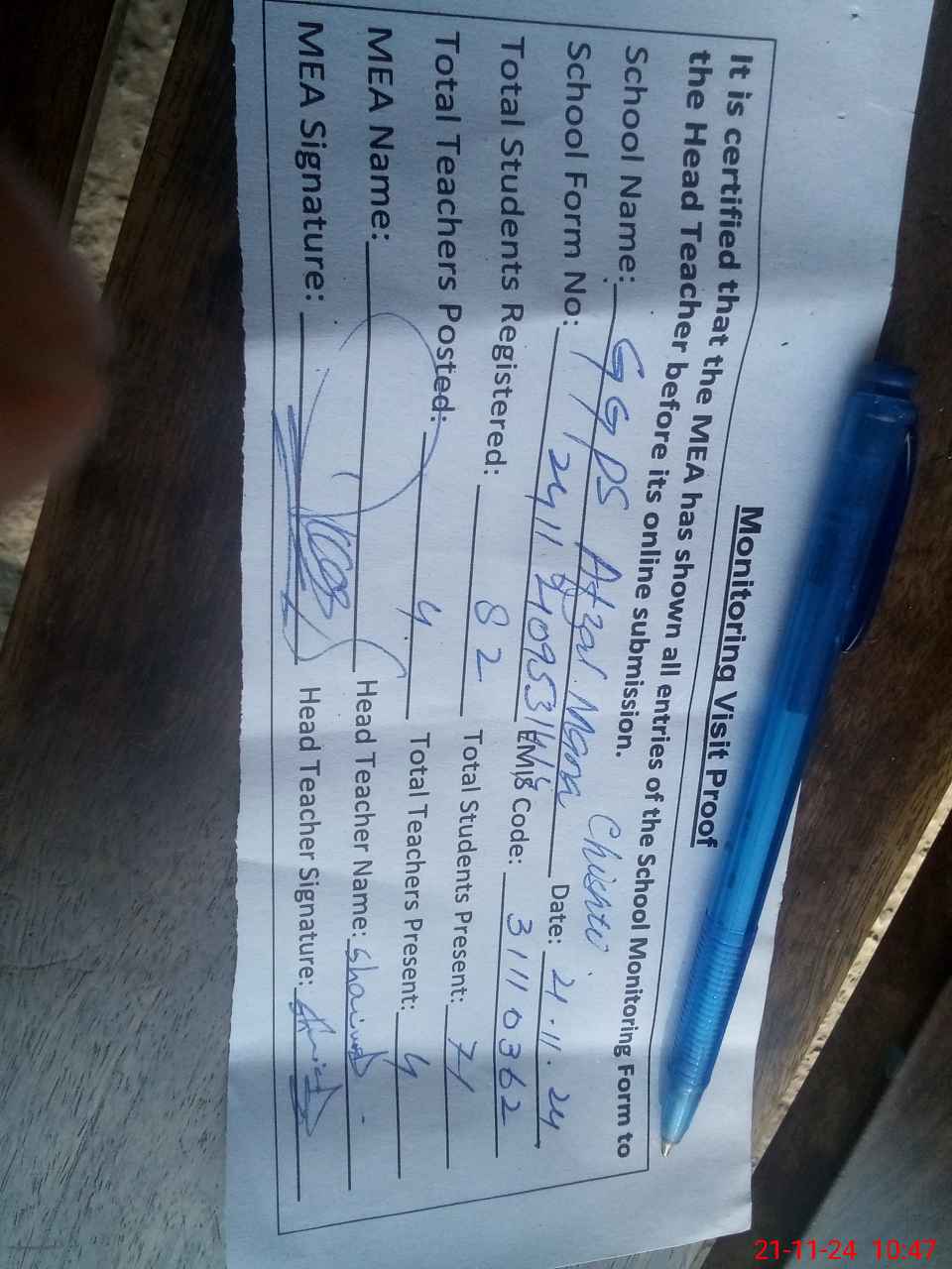 | Attendance Register | Head Teacher | MEA with School | Visit Proof |