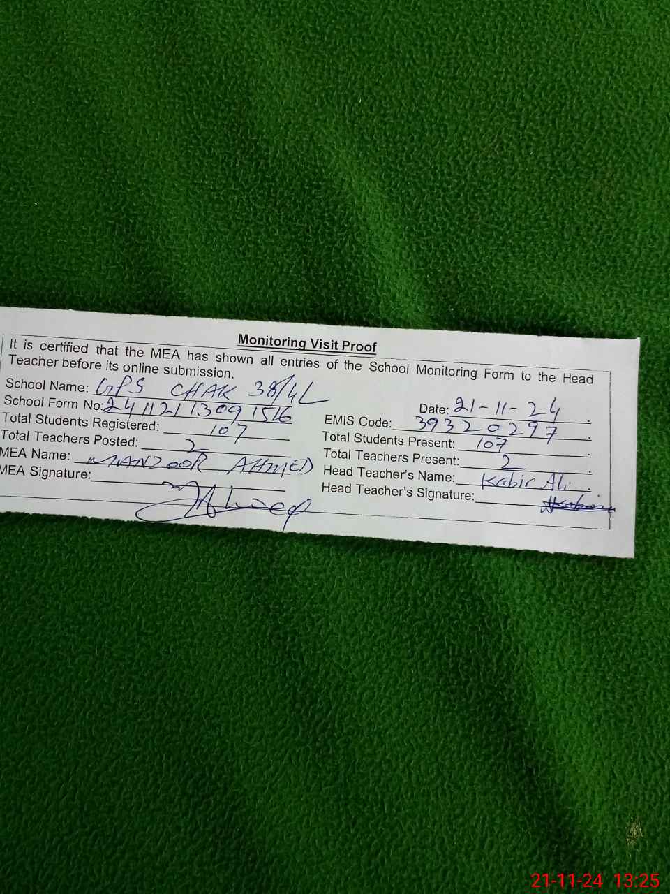| Certified that this School was Inspected by the Undersigned MEA/DMO Today and the Information Stated Above is as Per Record. | |||||