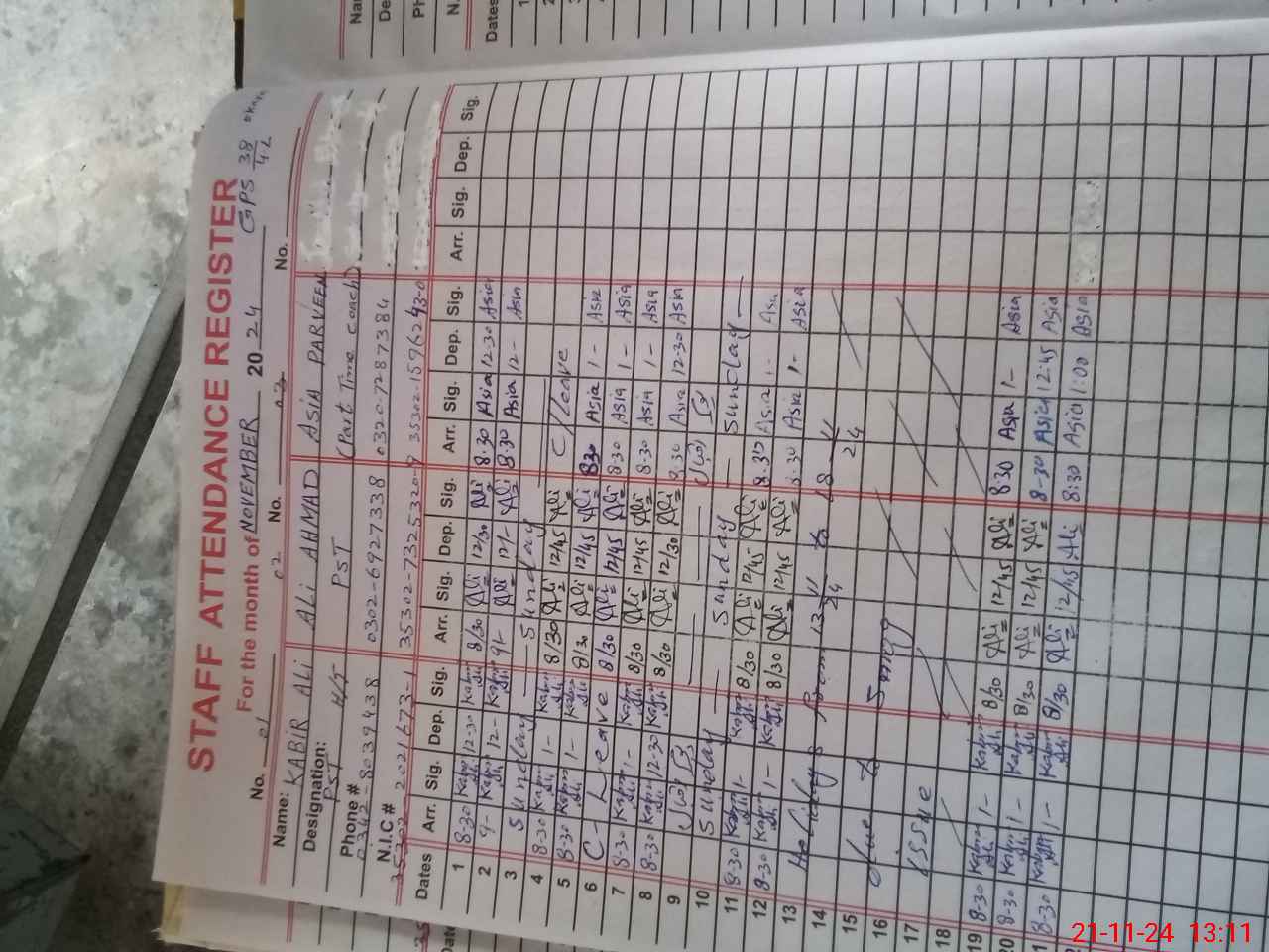 | CNIC | Full Name | Designation | R/C | Absence During Last Calender Month |