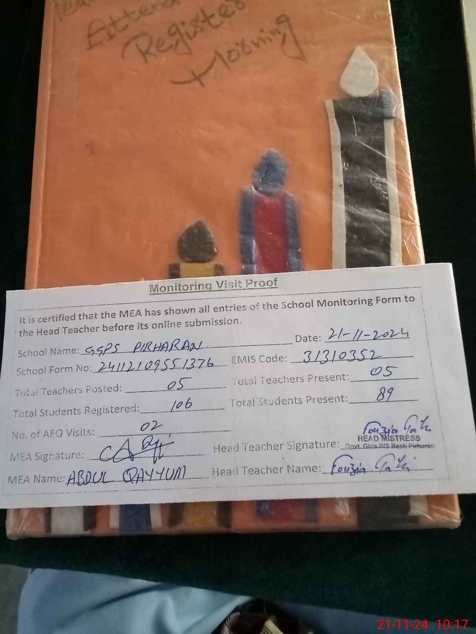 | Attendance Register | Head Teacher | MEA with School | Visit Proof |