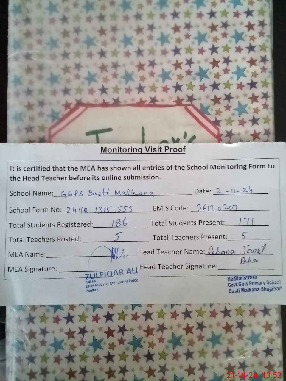 | Remarks (Use Separate Page if Required): Presence of students is taken from Roznamcha because morning shift was packed up however in following classes presence is contradictory Nursery Average presence is 25 Class 4 In previous months average presence was 15 to 17 Class 5 In previous months average presence was 8 to 10 Todays current Presence of Afternoon shift is noted | |||||