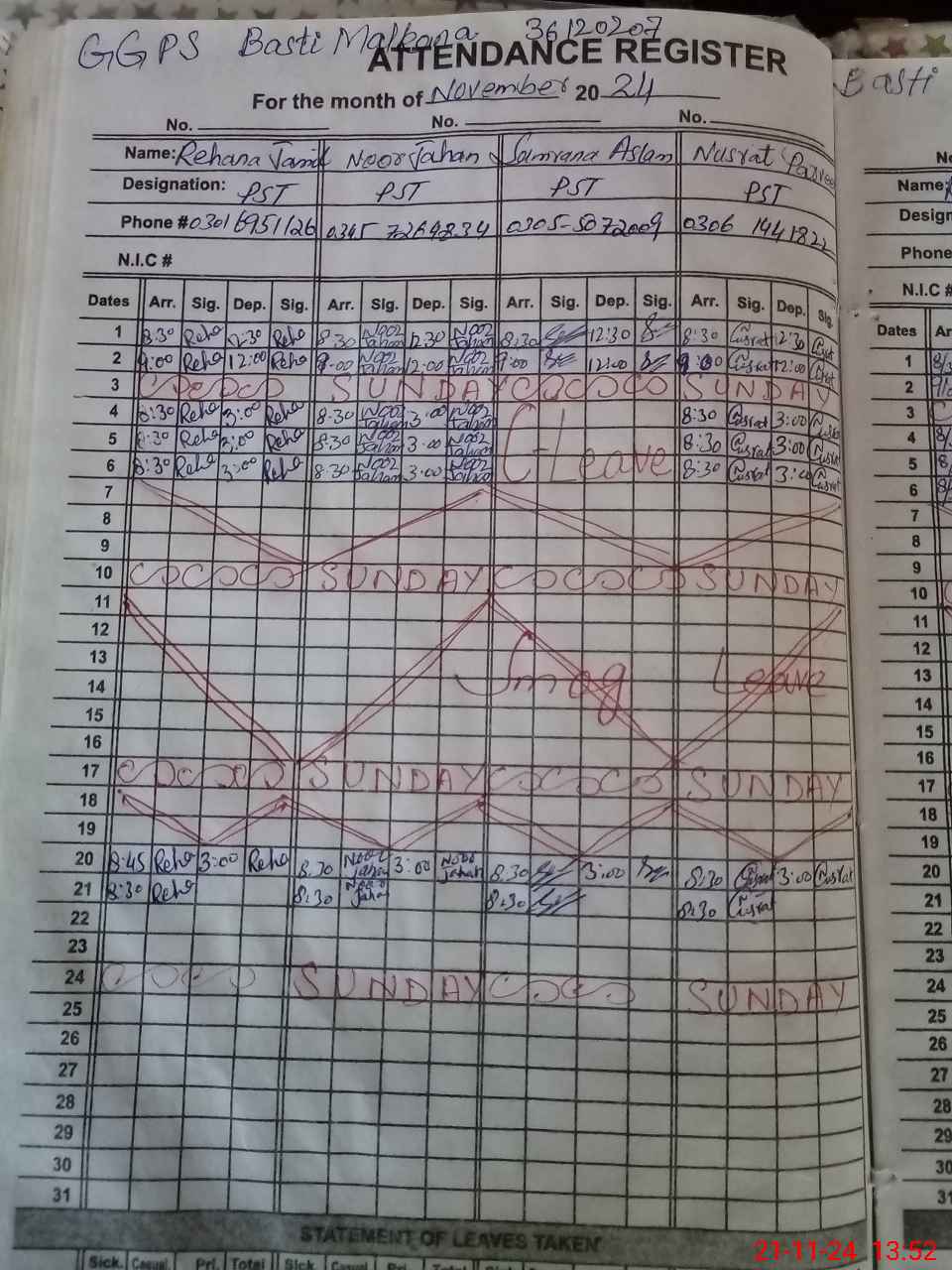 | CNIC | Full Name | Designation | R/C | Absence During Last Calender Month |