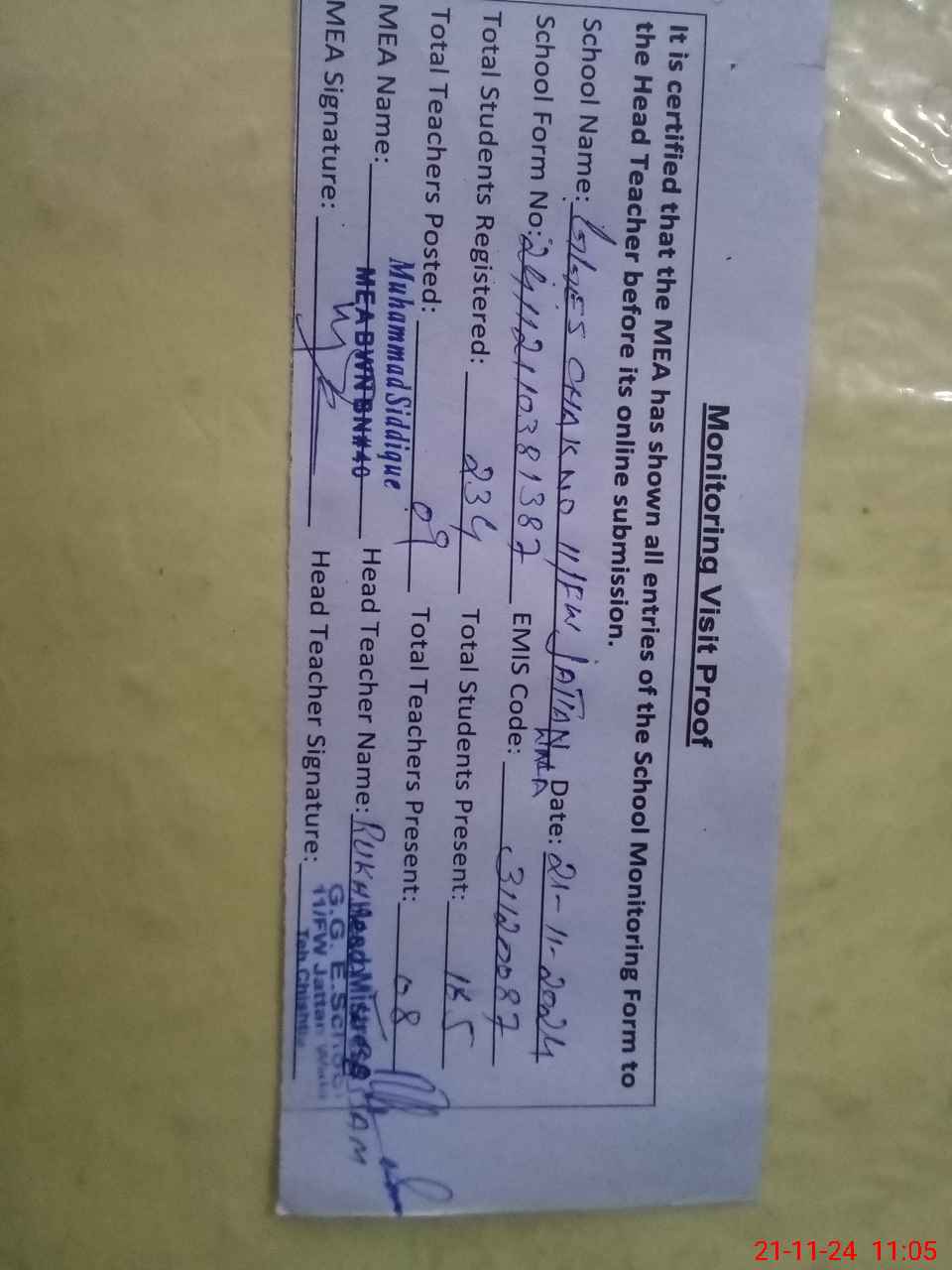 | Attendance Register | Head Teacher | MEA with School | Visit Proof |