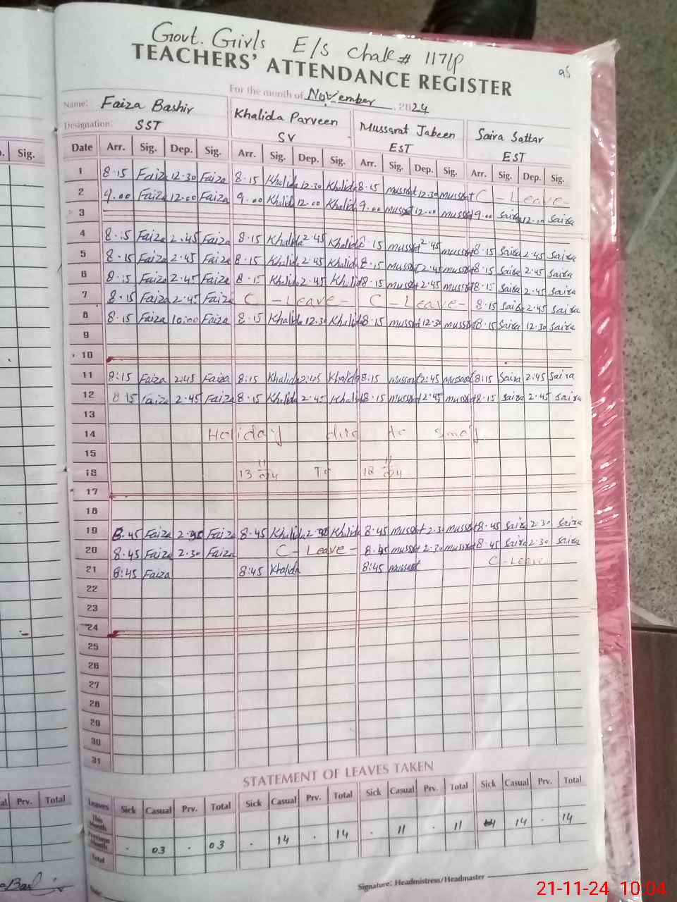 | Leave | Duty | Absent | Maternity | Medical | Ex- Pak |