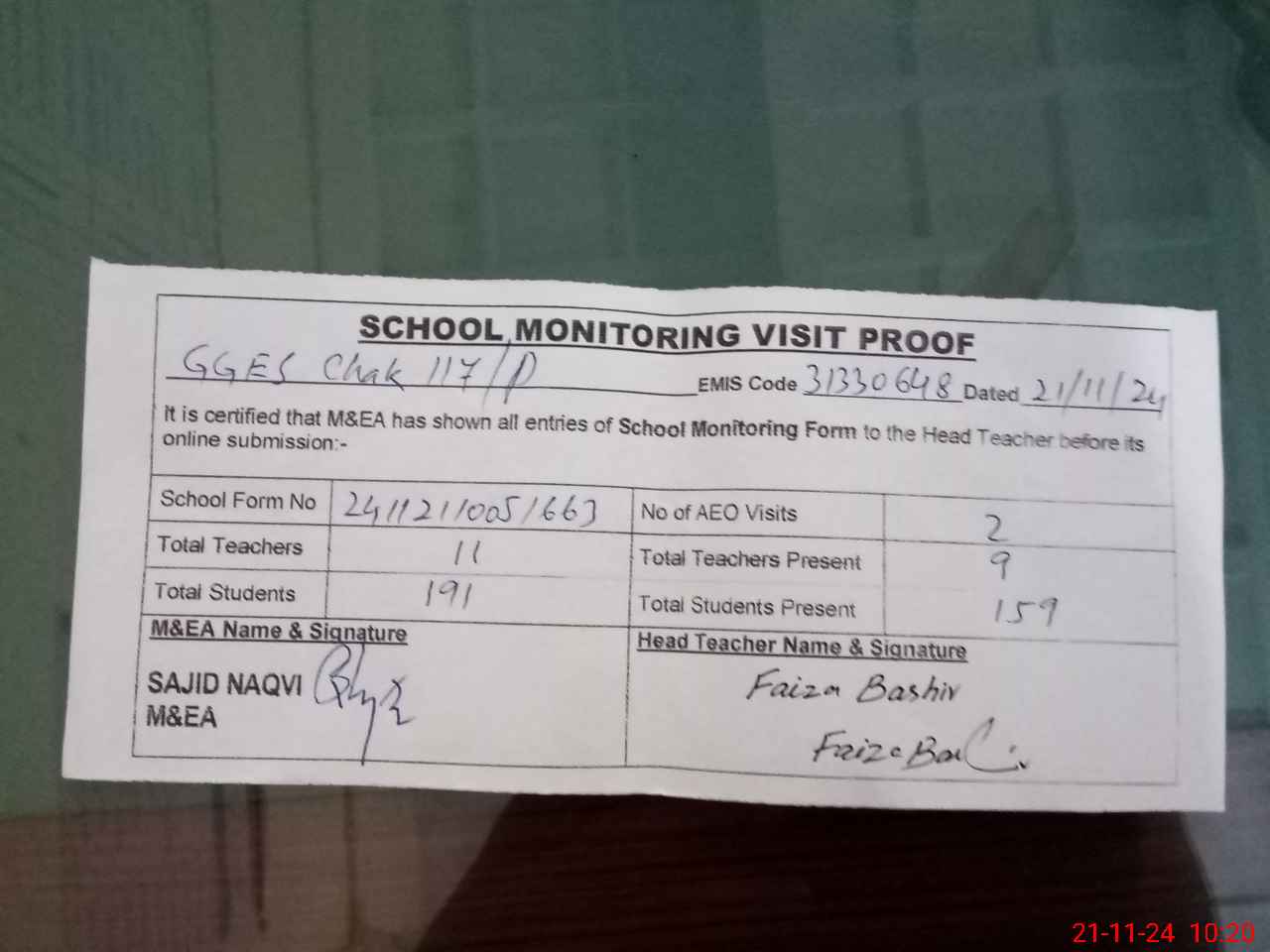 | Attendance Register | Head Teacher | MEA with School | Visit Proof |