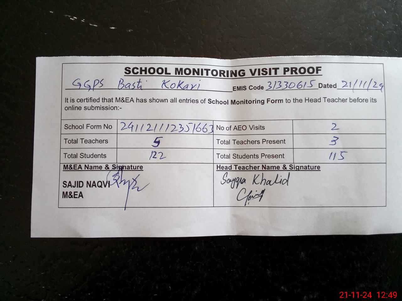 | Attendance Register | Head Teacher | MEA with School | Visit Proof |