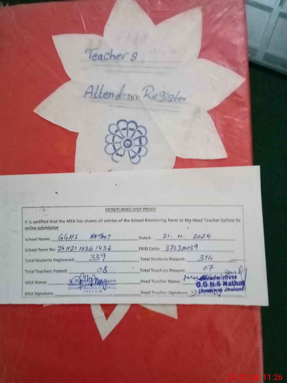 | Attendance Register | Head Teacher | MEA with School | Visit Proof |