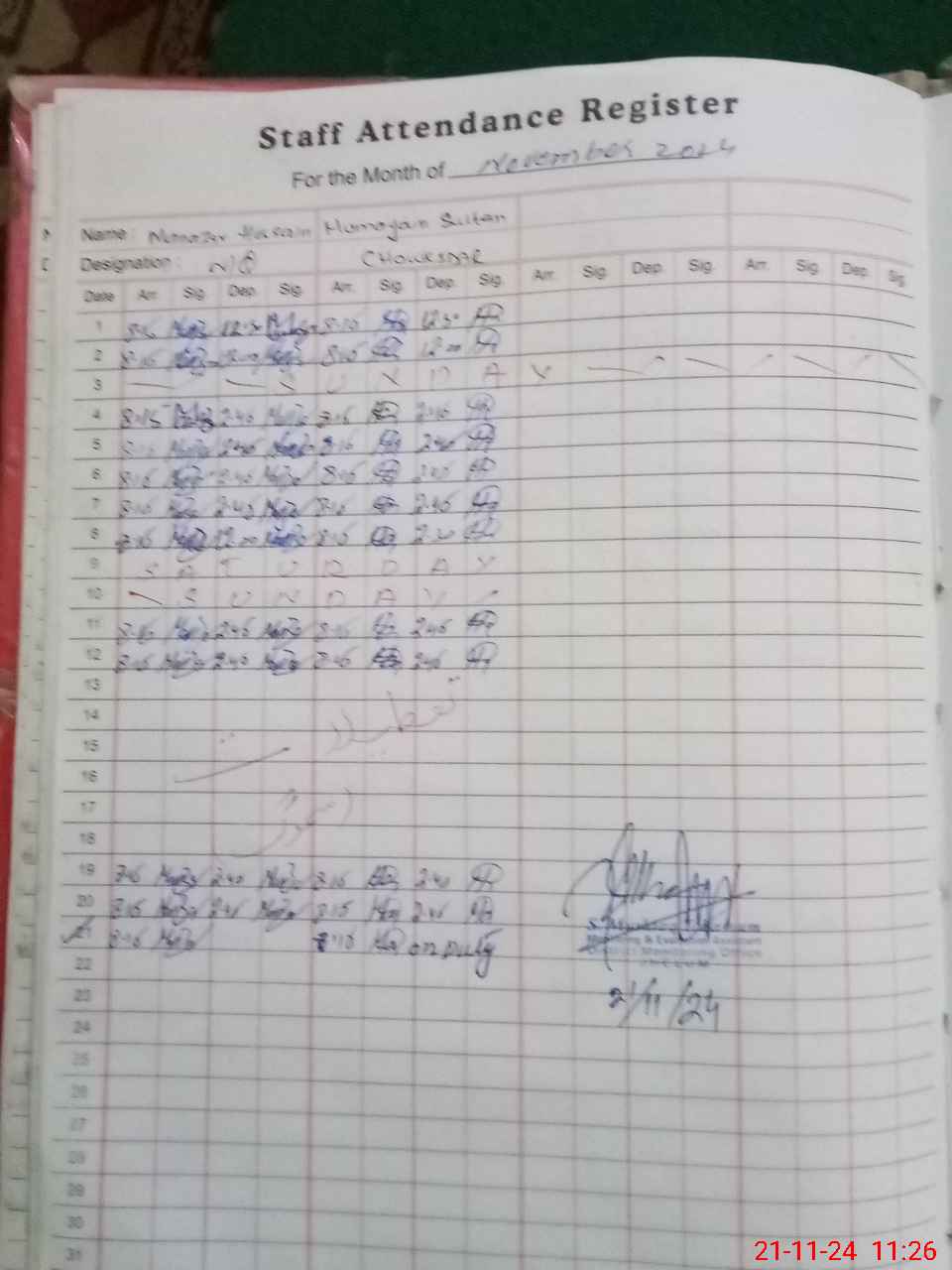| CNIC | Full Name | Designation | R/C | Absence During Last Calender Month |