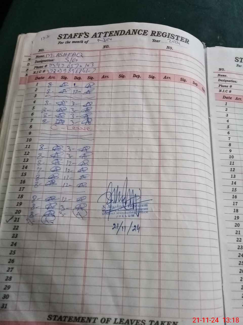 | CNIC | Full Name | Designation | R/C | Absence during last cal. month |