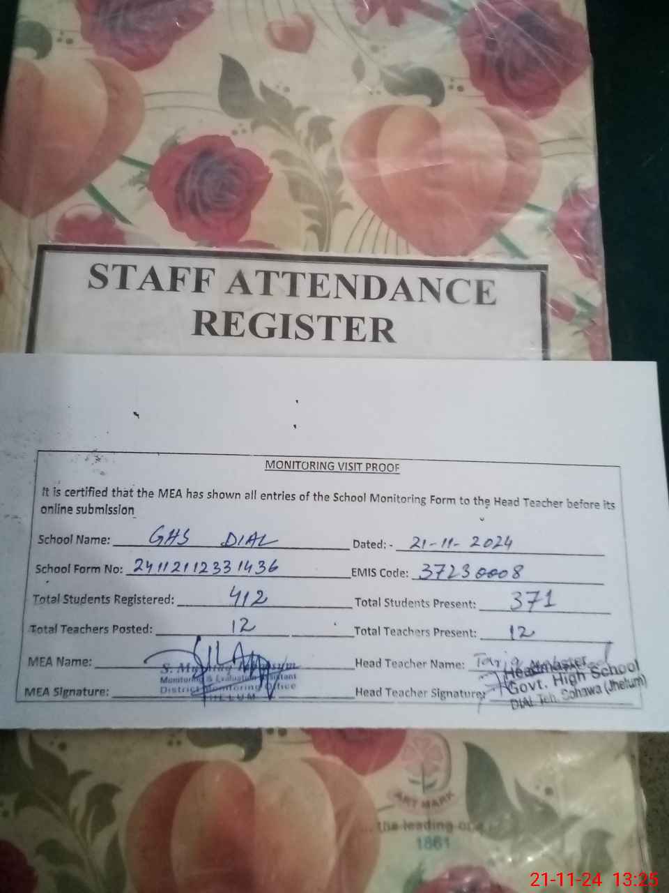| Attendance Register | Head Teacher | MEA with School | Visit Proof |