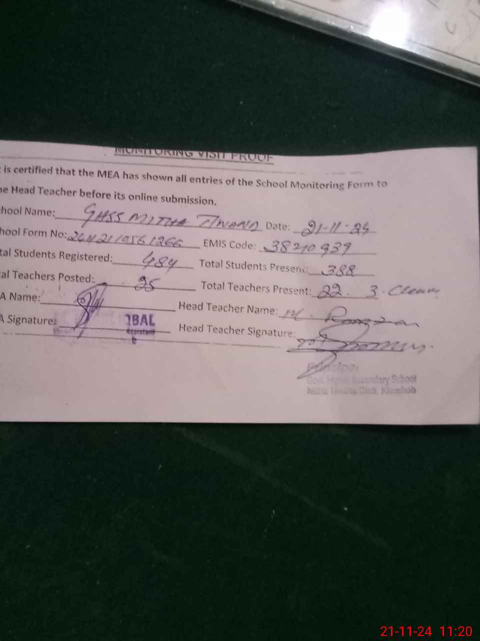 | Attendance Register | Head Teacher | MEA with School | Visit Proof |