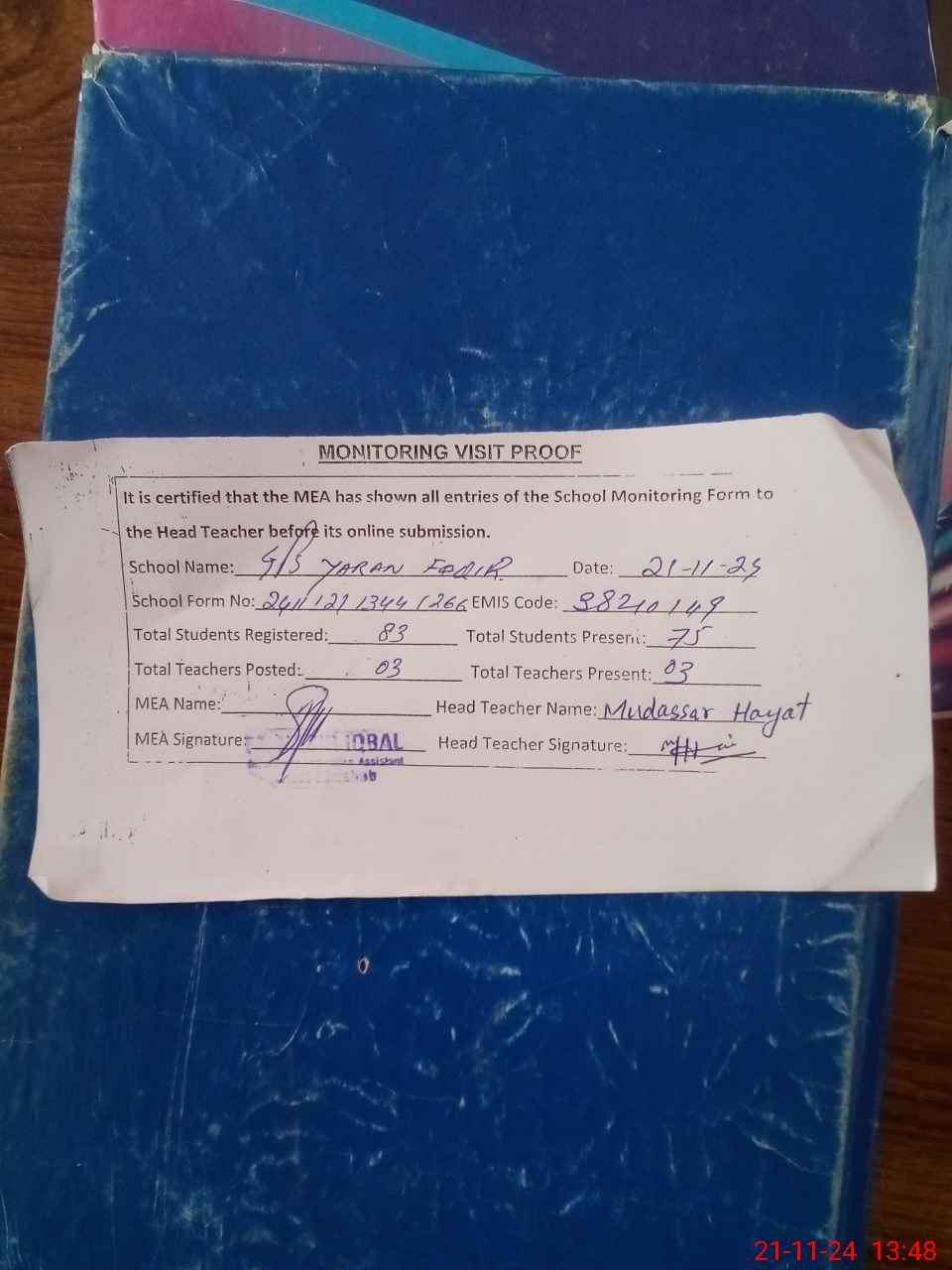 | Attendance Register | Head Teacher | MEA with School | Visit Proof |