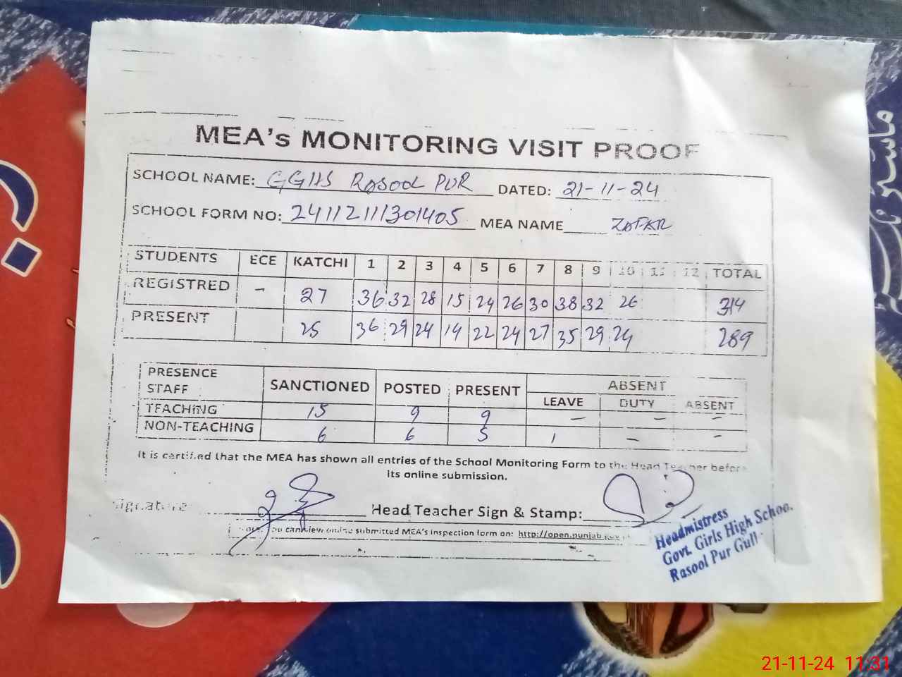 | EMIS Code: 36410494 | Name of School: GGHS RASOOL PUR GULLA, NAWAN SHEHR | |||