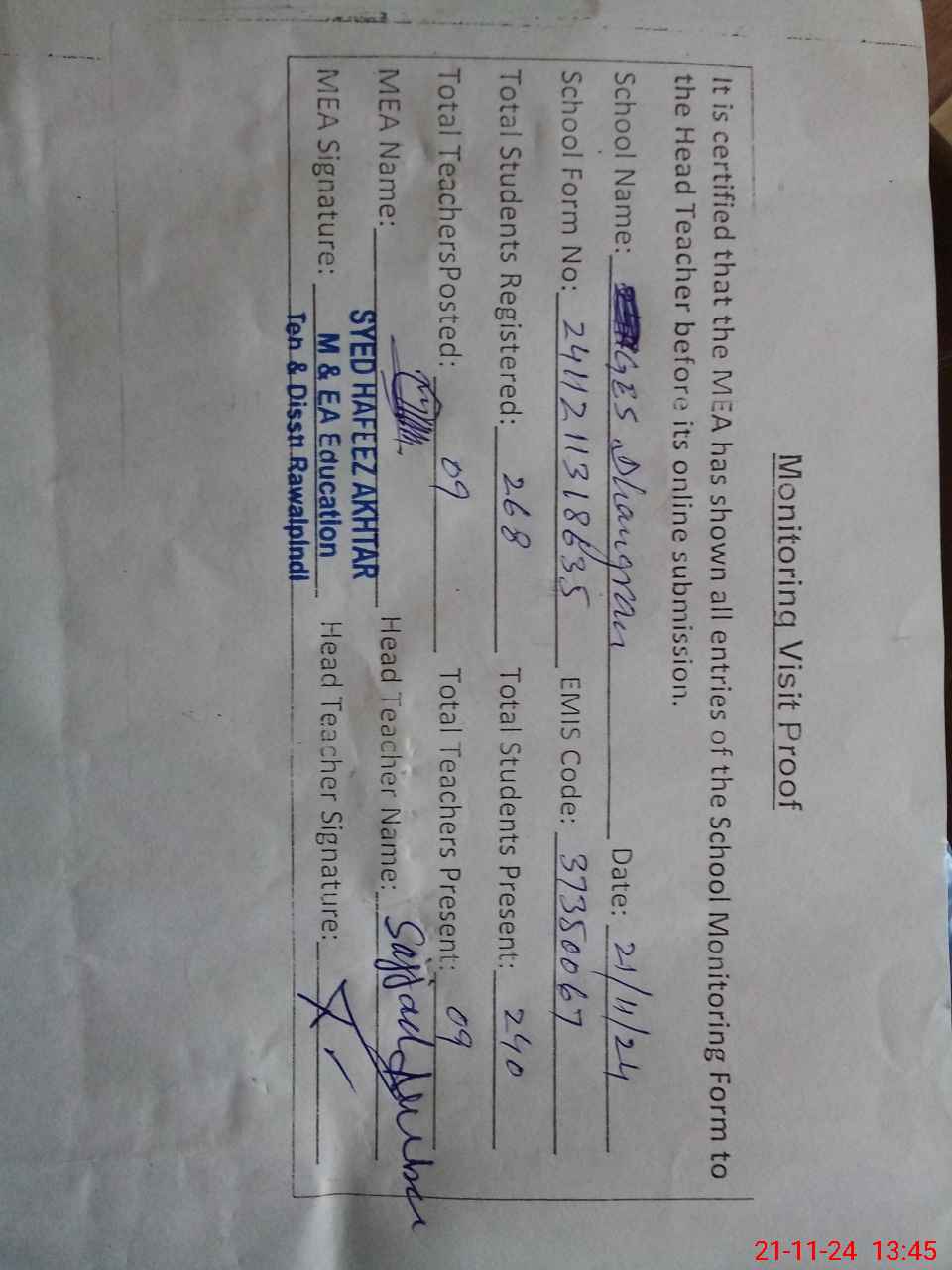 | Name: SA**** AK**** Designation: (School Headmaster's/Headmistress's) EST Phone/Cell Number: 03**** |