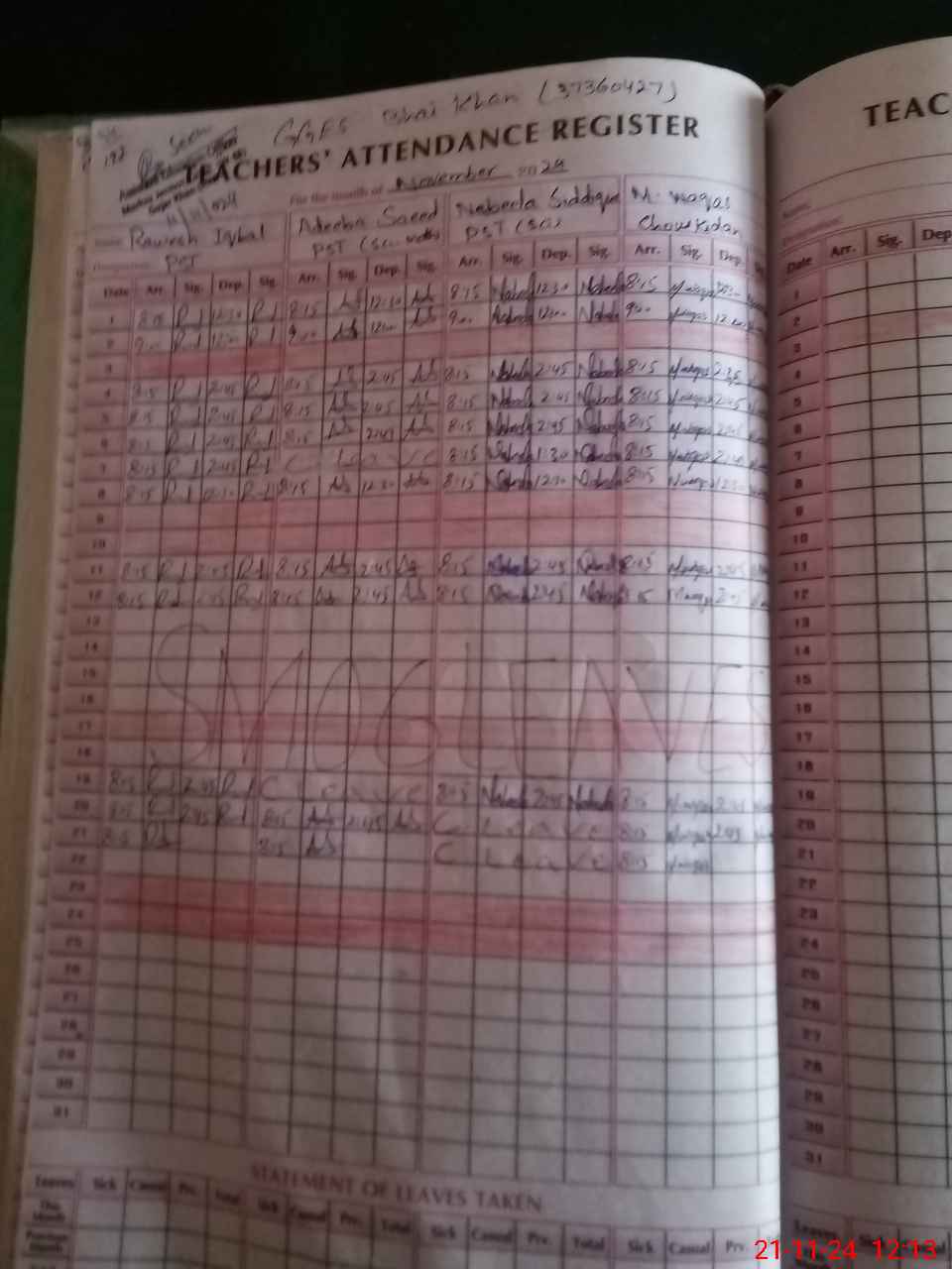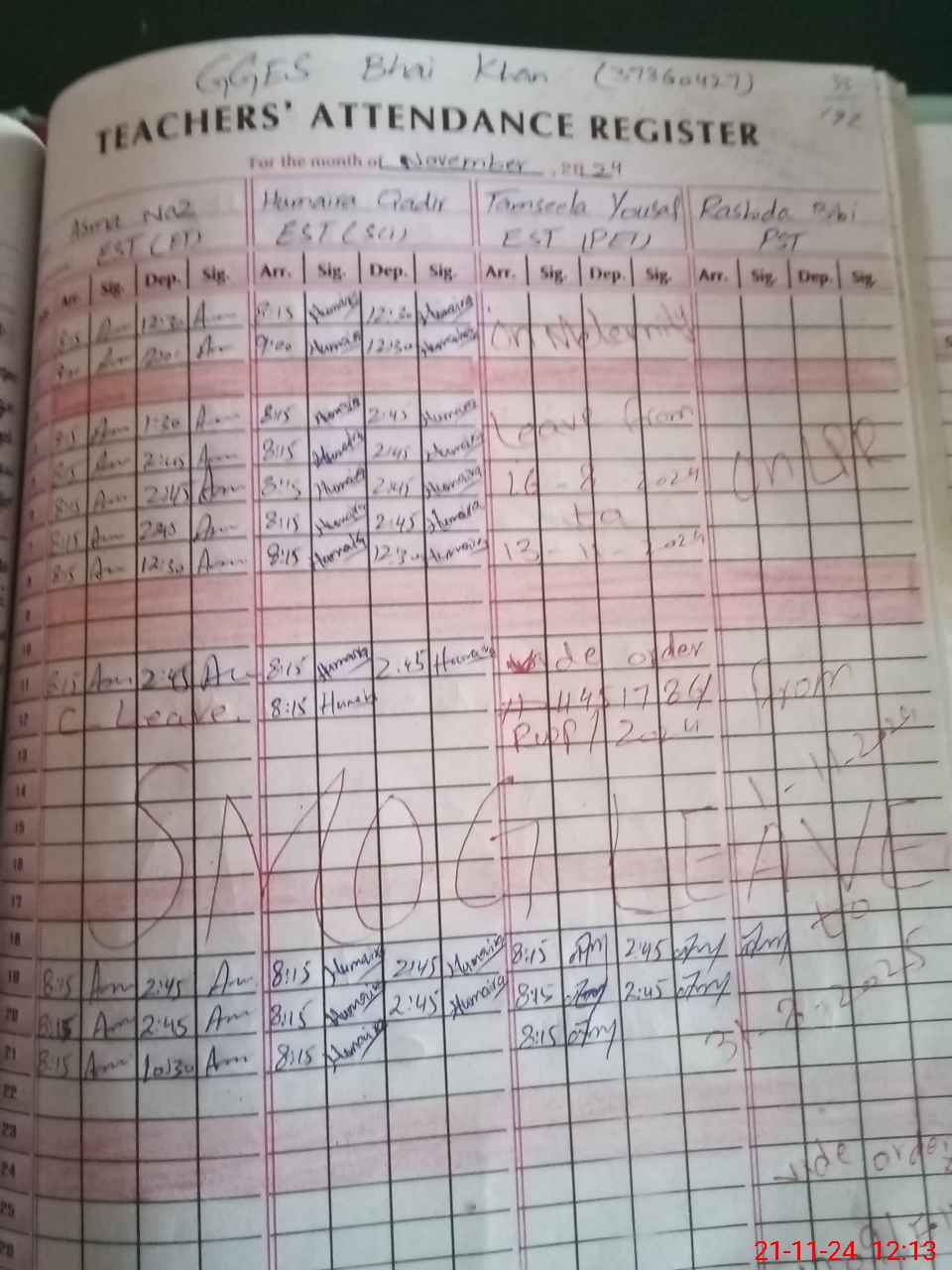 | CNIC | Full Name | Designation | R/C | Absence During Last Calender Month |